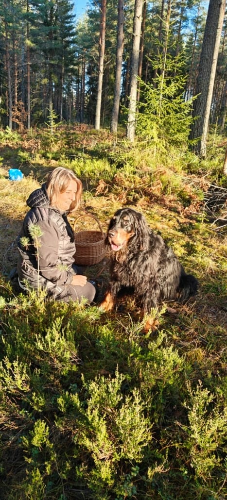 Kuvassa Marjut sienimetsällä Olavin kanssa