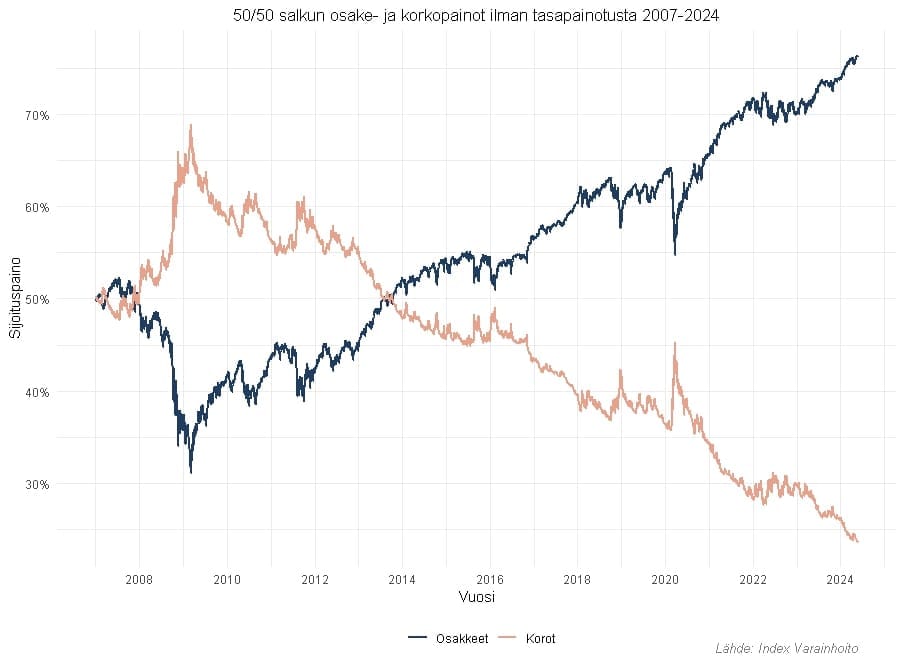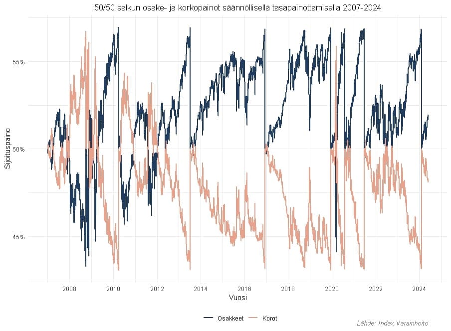 Alla olevassa kuvassa 1 on havainnollistettu, miten vuonna 2007 tehty 50/50 osake-korko-salkun osake- ja korko-osuuden painot ovat muuttuneet osta-ja-pidä-periaatteella. Osakepaino on finanssikriisin pohjalla ollut alimmillaan melkein 30 % ja korkojen paino 70 %. Ajan myötä osakepaino on tämän jälkeen kasvanut yli 75 %:iin ja korkojen osuus laskenut 25 %:iin.