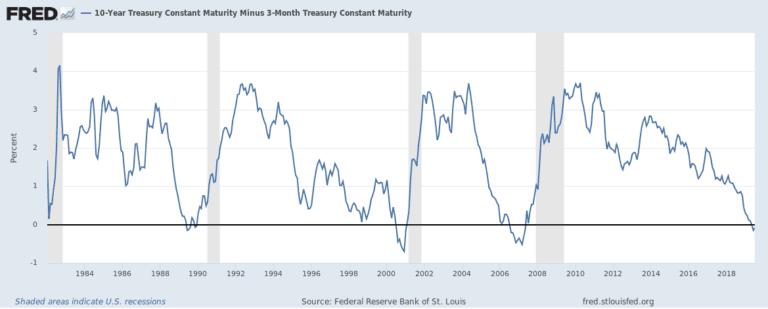 Seuraava kuva esittää USA:n 10 vuoden koron ja kolmen kuukauden koron erotusta vuodesta 1982. Pystypylväät ovat USA:n talouden taantumia. Kuva löytyy FED:n FRED-tietokannasta.