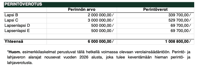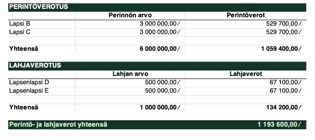 A:lla on kaksi lasta B ja C, joista molemmilla heistä on kaksi lasta (lapsenlapset D, E, F ja G). A:n kokonaisvarallisuuden arvo on 6.000.000 euroa, eikä hänellä ole velkoja. A:n varallisuus koostuu sijoitusasunnoista sekä rahasto-osuuksista. A ei ole tehnyt testamenttia. A:n kuoltua hänen koko omaisuutensa siirtyy tasaosuuksin hänen kahdelle lapselleen B:lle ja C:lle.